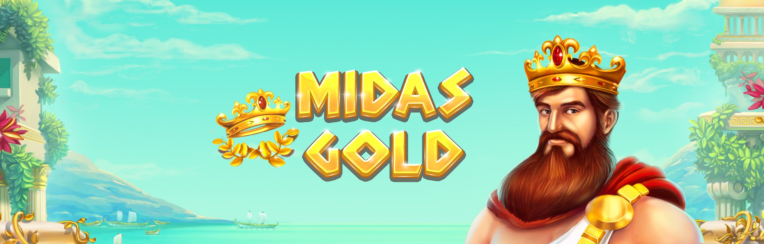 When the King Midas symbol lands on the reels, the Midas Touch feature is triggered. King Midas picks one of the symbol types on the reels and turns it golden with his touch. Golden symbols are locked into place for a respin. Any new symbols of the same type picked by King Midas will also turn golden and lock for a new respin. Respins continue until no new golden symbols land. The win is paid when the respins stop. If King Midas lands on the reels again during a respin, he will pick a new higher value symbol to turn golden and lock. Any existing golden symbols on the reels will swap for the higher value symbol chosen, and will be locked for the respin.